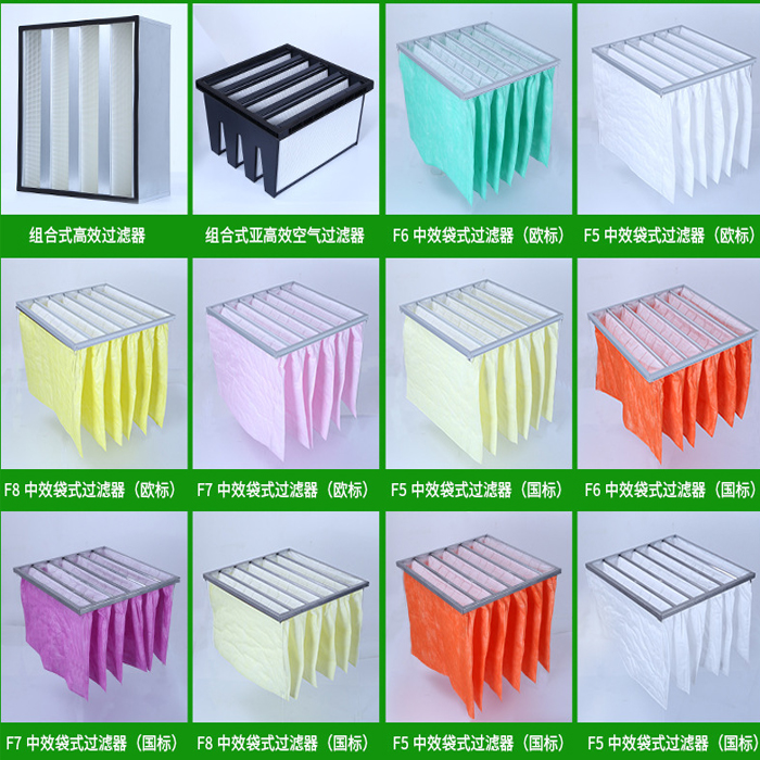 中效空氣過濾器分袋式和非袋式兩種,其中袋式包括F5,F6,F7,F8,F9,非袋式包括FB(板式中效過濾器),FS(隔板式中效過濾器),FV(組合式中效過濾器)。